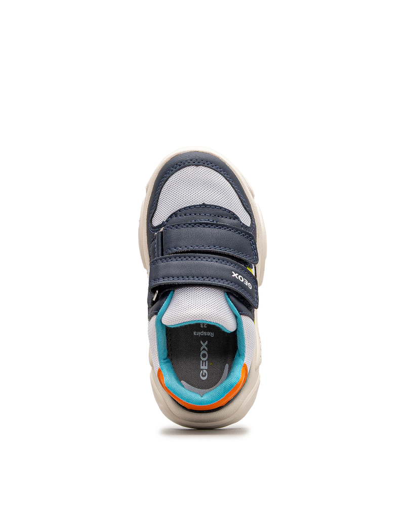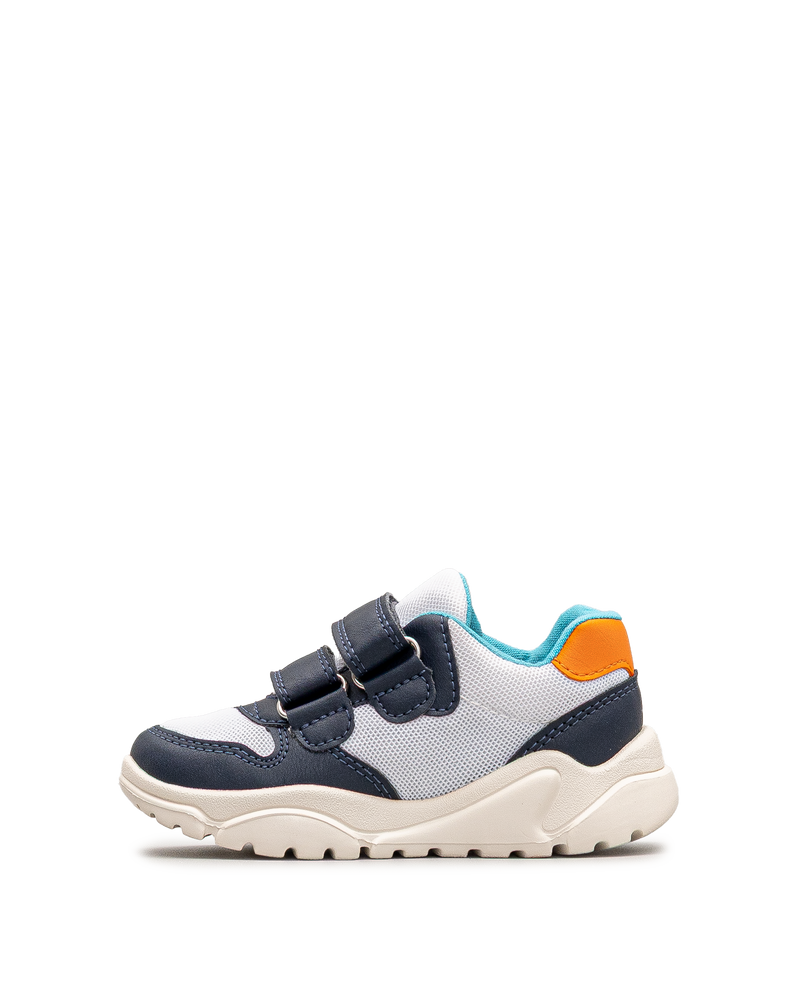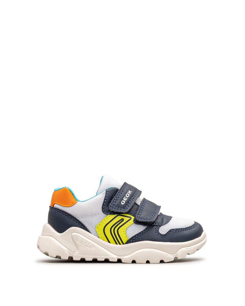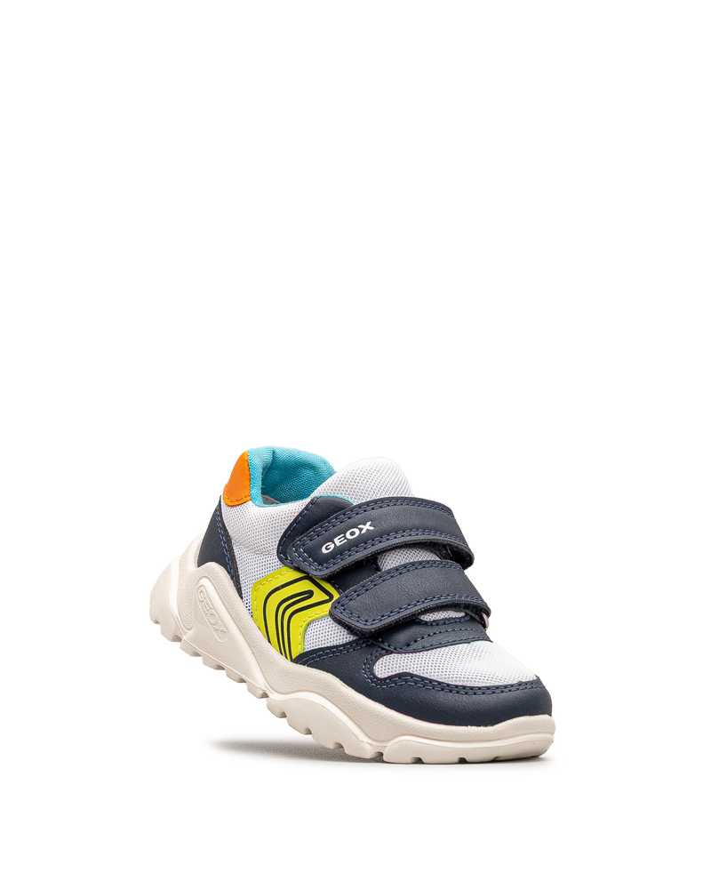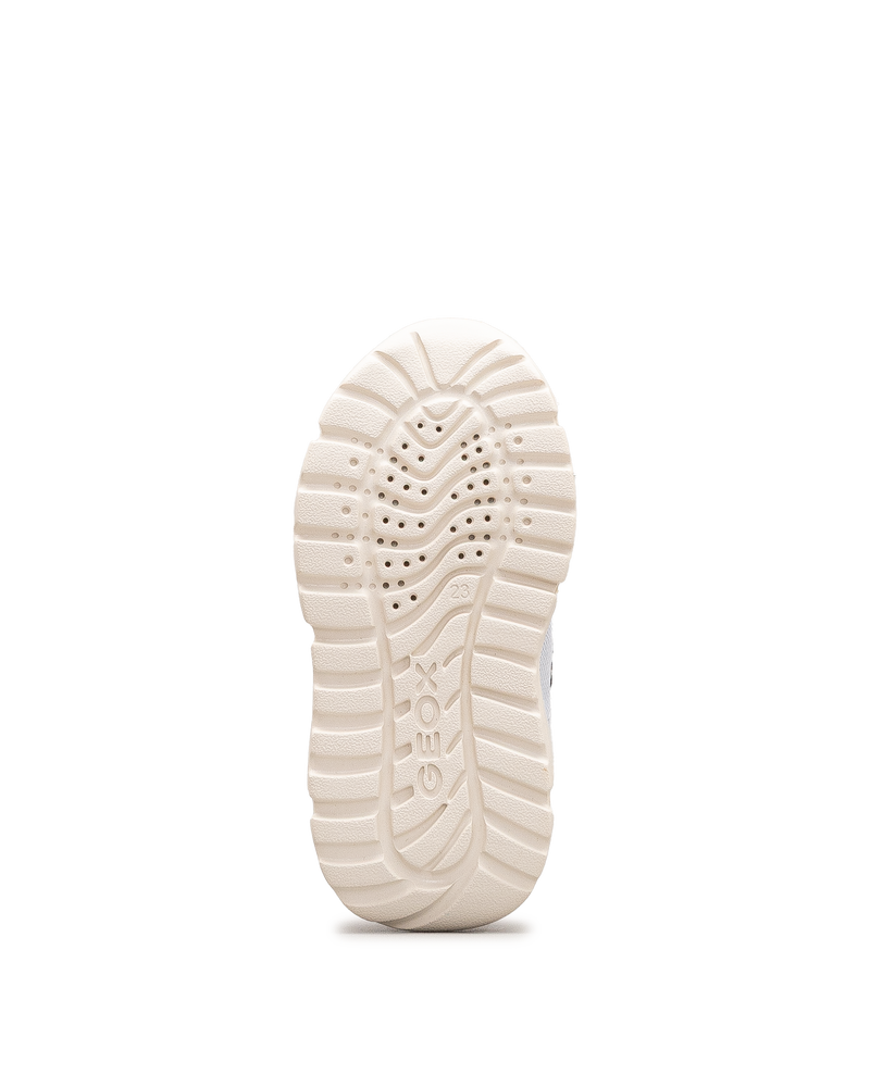 Ces chaussures blanc et bleu sont idéales pour les petits explorateurs actifs. Leur semelle épaisse procure un excellent amorti au quotidien. Faciles à enfiler grâce aux bandes velcro, elles maintiennent le pied avec efficacité. Geox mise ici sur un design dynamique et respirant pour accompagner les enfants avec style.
