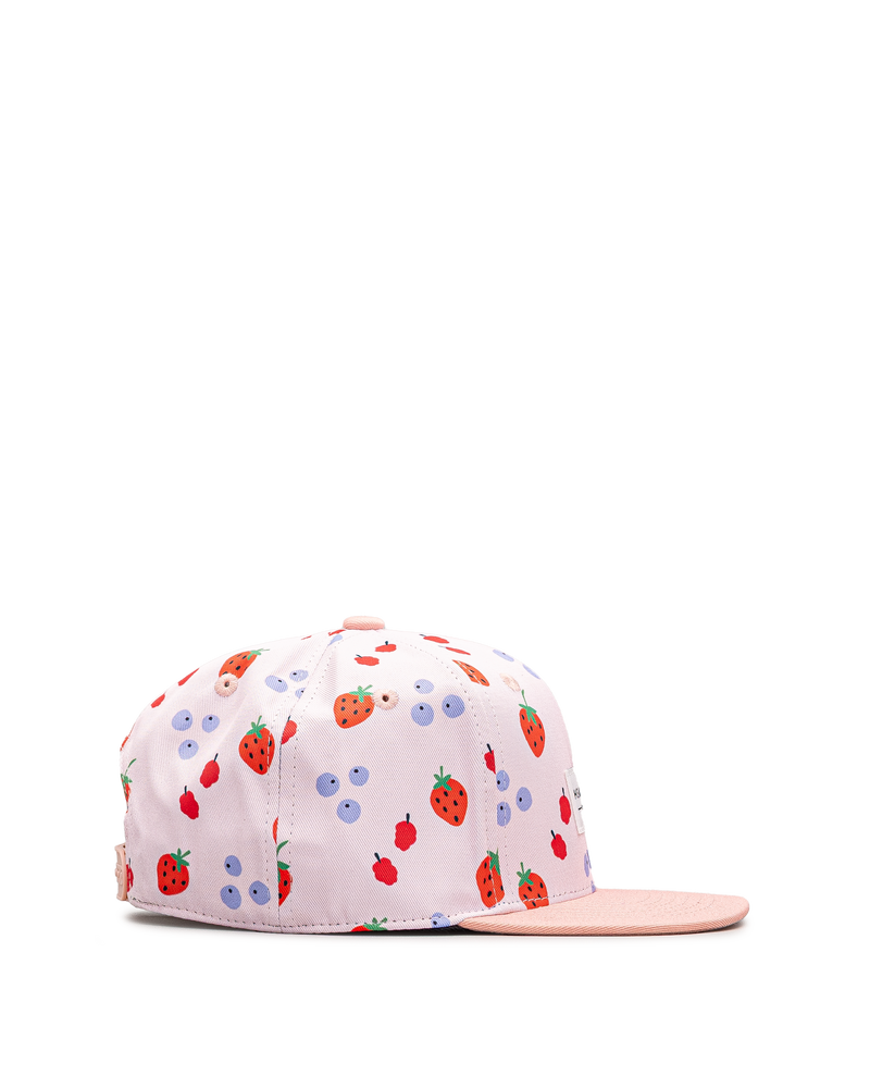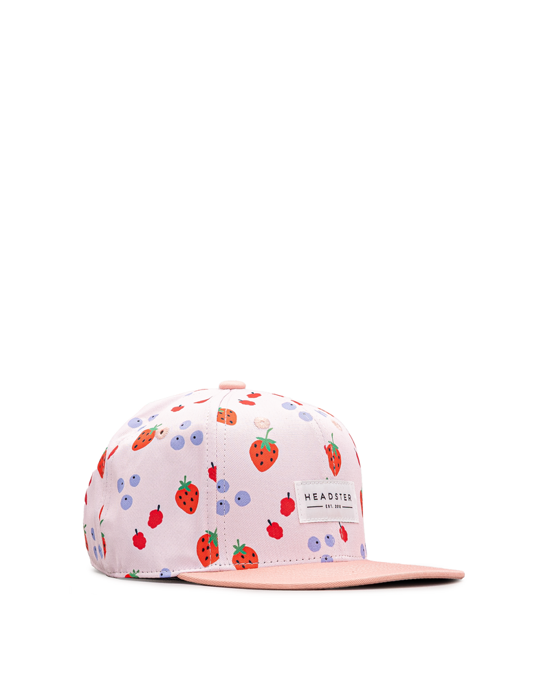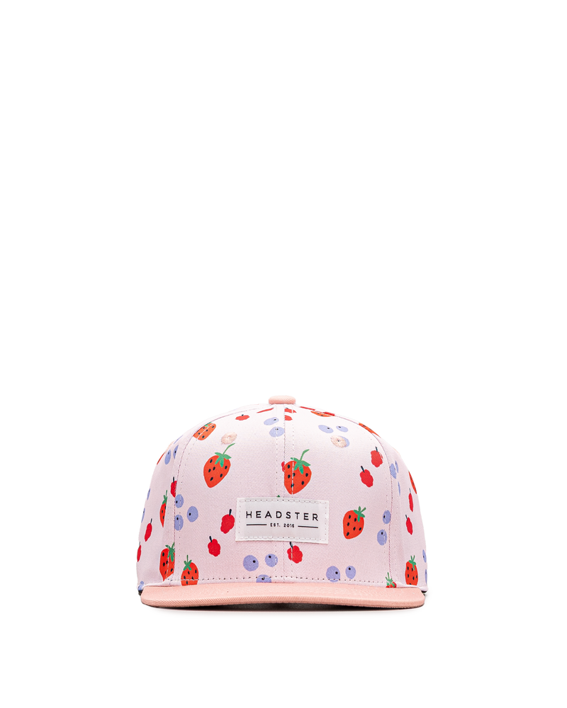 Cette casquette Headster rose pâle présente de mignons motifs de fraises, bleuets et framboises. Son allure fruitée respire la fraîcheur estivale. Elle se règle facilement pour convenir à toutes les têtes. Un accessoire idéal pour les enfants au style doux et enjoué.