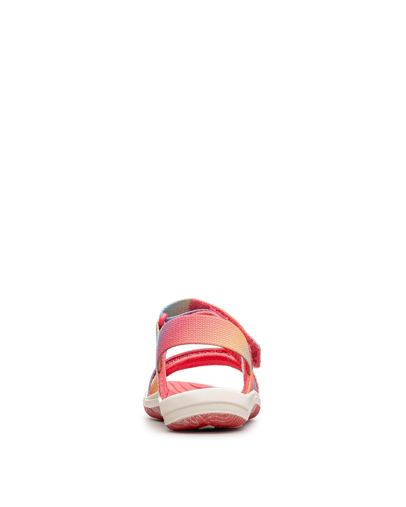 Ces chaussures Keen rose affichent un dégradé arc-en-ciel éclatant allant du rose vif au bleu ciel, en passant par le pêche et le jaune. La bride avant large à fermeture velcro et la bride arrière assortie assurent un maintien ajustable et un enfilage facile. La semelle intérieure texturée à motif vagues offre amorti et confort, tandis que la semelle extérieure blanche légère convient aux journées actives. Bout ouvert pour une sensation de liberté.