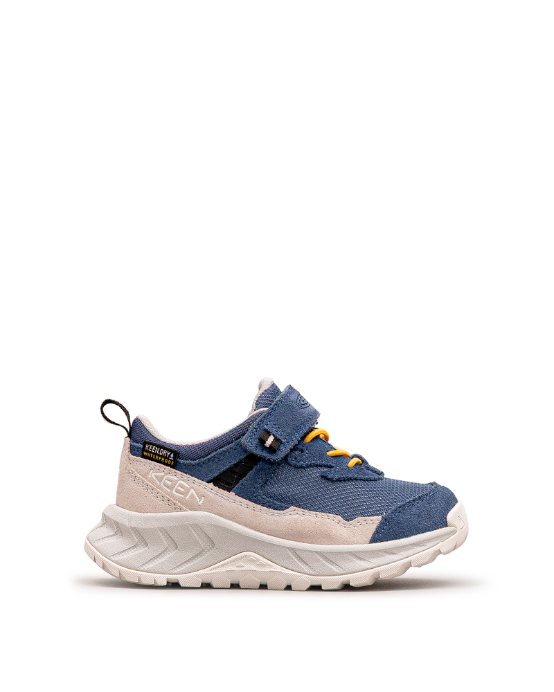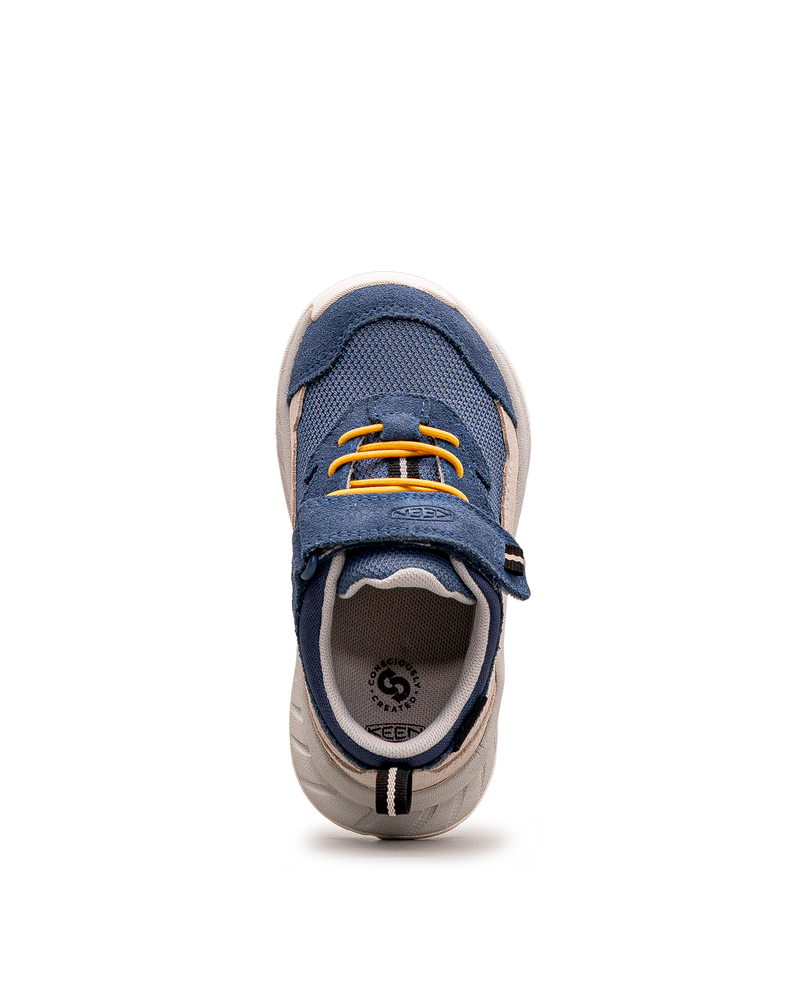 Ces chaussures marines affichent un design technique pour les aventures extérieures. Leur construction imperméable protège contre l'humidité. Les lacets jaunes et la fermeture velcro garantissent un ajustement sécurisé. Le bout renforcé et la semelle robuste offrent protection et stabilité. Idéales pour la randonnée et les jeux en plein air. Un modèle résistant et fiable signé Keen.