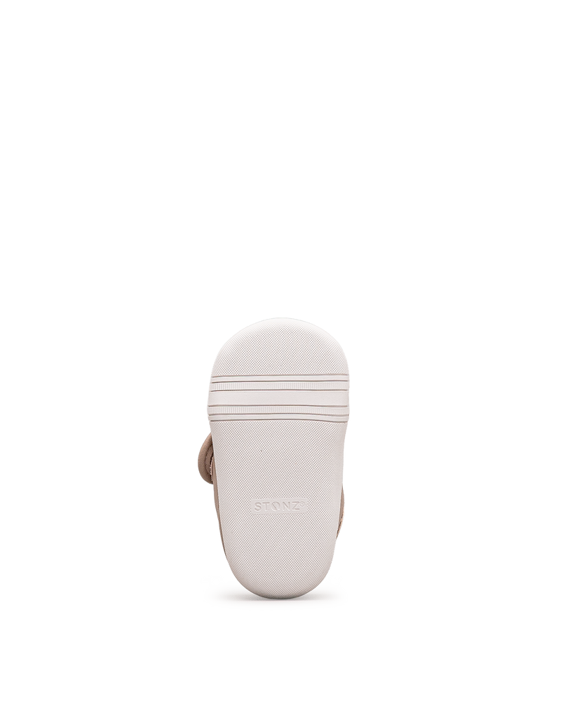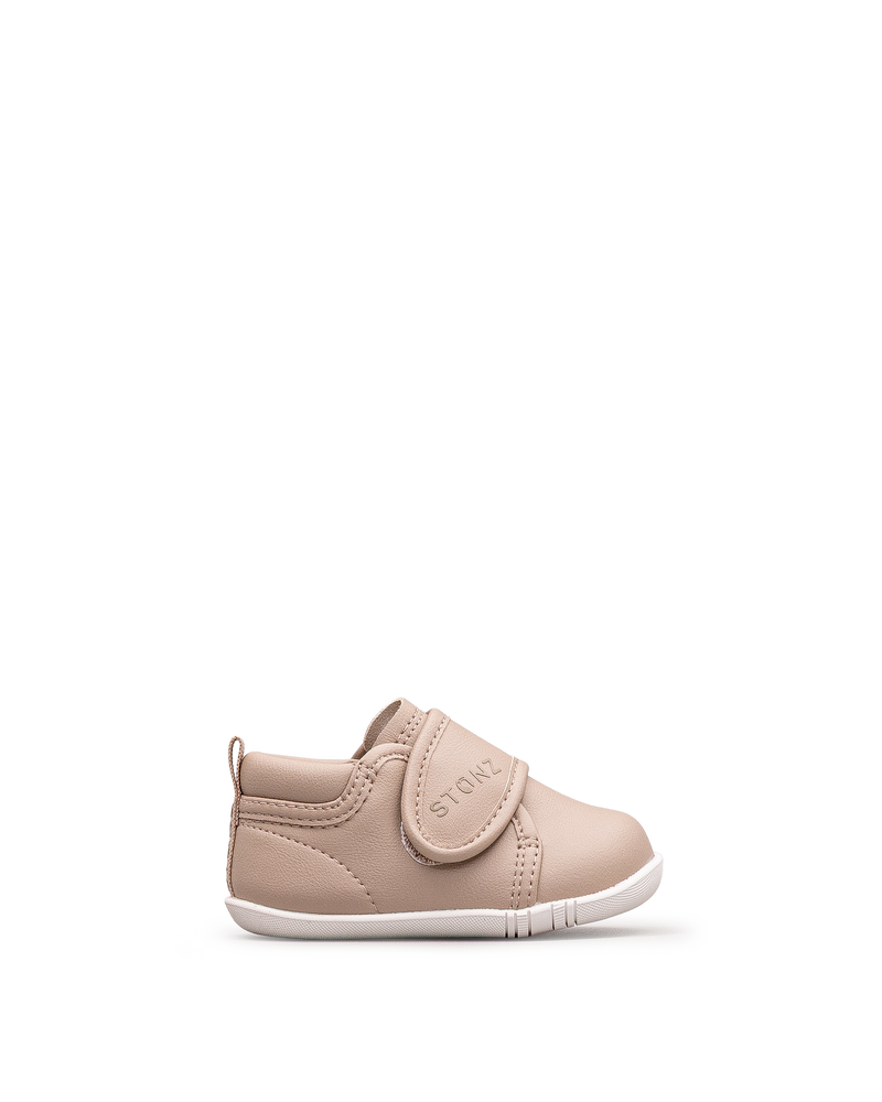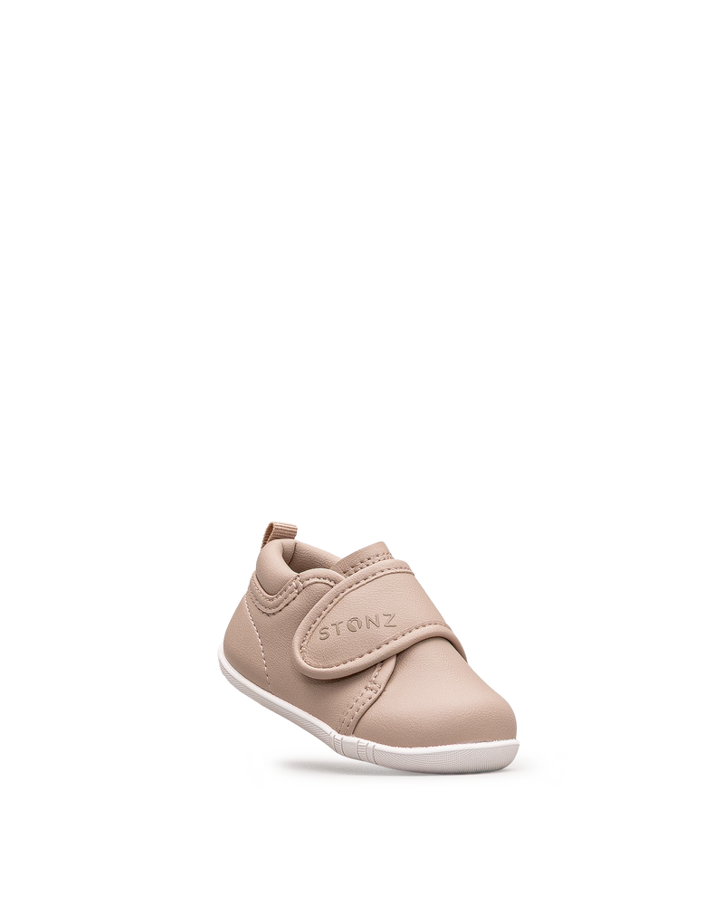 Ces chaussures beiges se distinguent par leur design raffiné et leur grande souplesse, idéales pour les premiers pas de bébé. Leur semelle légère et flexible favorise un développement naturel du pied. Faciles à enfiler grâce à leur fermeture pratique, elles assurent un ajustement parfait. Un choix idéal pour combiner élégance, confort et la qualité Stonz.